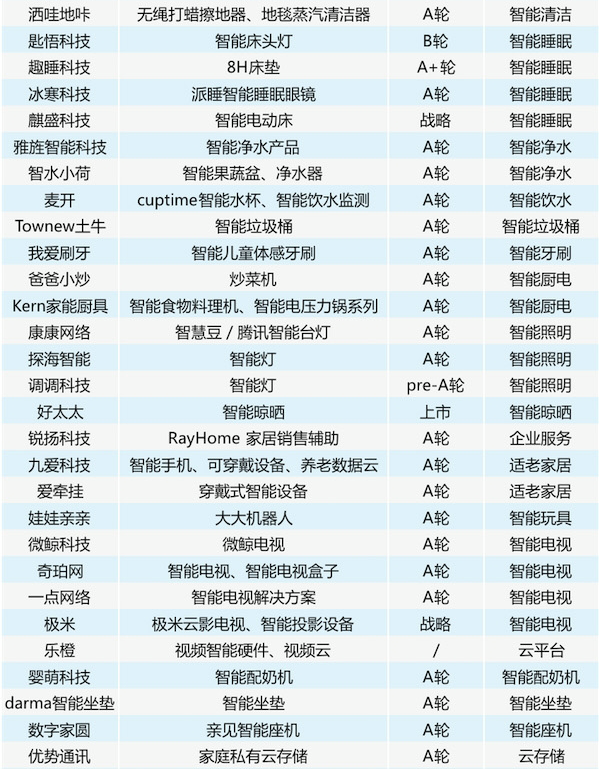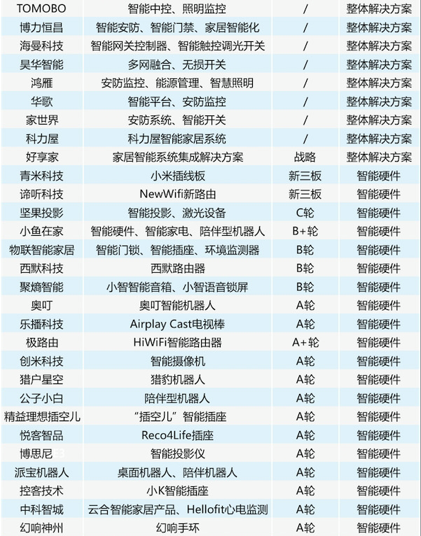 与争夺家庭场景的控制权相比,智能家居单品看起来门槛更低、竞争也没那么激烈。但事实并非如此,智能硬件、智能安防和空气检测领域也有不少创业公司出现。智能硬件企业中,不乏像青米科技、小鱼在家、猎户星空等找到“爸爸”的创业公司,安防企业中,也有像极联、蜗牛管家等实力雄厚的创业公司。
