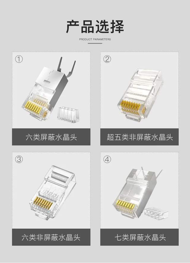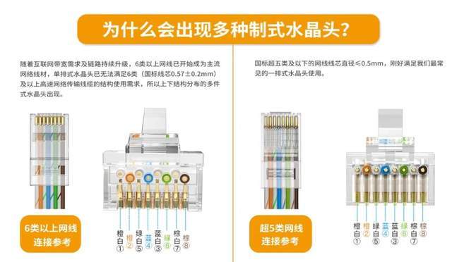 因为国标超五类及以下的网线线芯直径≤0.5mm,刚好满足我们最常见的一排式水晶头接线使用。随着互联网带宽需求及链路持续升级,6类及以上网线已开始成为主流网络线材,所以上下结构分布的多件式水晶头出现,单排式水晶头已无法满足6类(国标线芯0.57±0.2mm)及以上高速网络传输线缆的结构使用需求,所以出现了上下式接线法及对应的多种水晶头套件。具体的可登陆秋叶原各大官方商城或线下授权体验店查询。