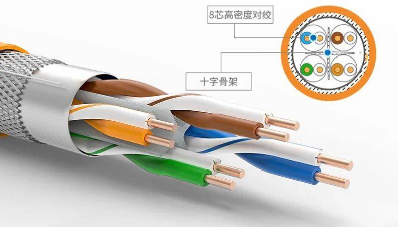 六类网线的传输频率为250Mhz,适用于传输速率高于1Gbps的应用,它的内部结构中八条线芯都是呈4对不同颜色的传输线对绞而成,除此之外还有一个特殊的绝缘十字骨架隔离四对双绞线。