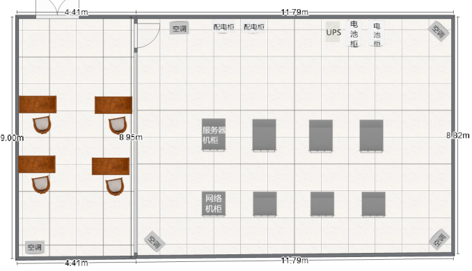 如图所示,机房内划分为设备区和操作区两个功能区域,操作区面积为9m*4.4m约39平方米,设置4个席位的工作台。设备区面积为9m*11.8m约106平方米,设计机房内共布置4个网络机柜、4个服务器机柜,用于放置网络、广播、监控、一卡通、服务器及存储设备,后续设备扩展可以再增加机柜。基本可以满足现在以及将来5-10年内的机房设备安装需要。