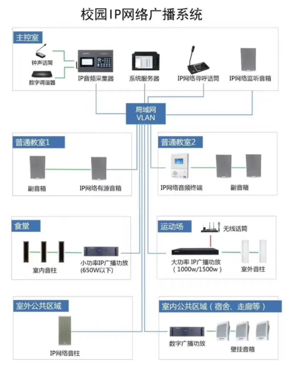 本次学校公共广播系统是一套纯数字音频广播系统,中心校区公共广播系统要求严格按照中心校区公共广播的设计要求,结合相关设计标准和建设图纸进行设计,公共广播系统设计要求主要满足校区的背景音乐播放、信息广播、广播通知等使用需求,公共广播系统的总服务器设备设于总控室,在总控室安装系统的总主控设备、音源设备、消防紧急联动设备、广播呼叫设备、周边设备等,总控室的系统服务器是整个系统的总服务器,承担整个系统的运行通信,对整个系统进行广播寻呼控制,背景音乐播放控制,支持广播系统数据和音频的传输,支持系统定时播放、终端点播、临时插播、消防紧急广播等系统服务器功能;同时提供高品质的背景音乐,背景音乐包括有CD播放器,数字调谐器,PC播放器等。在校区每栋楼的监控弱电箱设置安装IP网络适配器功放,IP网络适配器通过网络交换机与消防监控室IP网络广播系统服务器连接,音频IP网络音频解码终端主要对来自服务器的控制信号和音频信号进行实时解码和播放,把数字音频信号转换成模拟音频信号传输给功率放大器,最后传输到前端音箱,由音箱放声、双色LED灯发出响应颜色;整个学校广播具体配置如下: