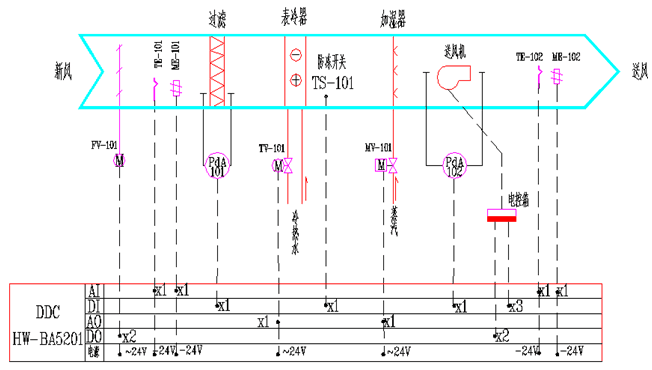DDC控制器对送风温度、湿度进行PID控制。通过调节冷冻水电动阀的开度,使送风温度、湿度保持在设定值范围内。当新风机停止时,冷水电动阀将会关闭。压差开关将会监察新风机过滤网的状况,当过滤网堵塞时,压差开关便会发出讯号,以催促维护人员清洗过滤网。