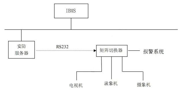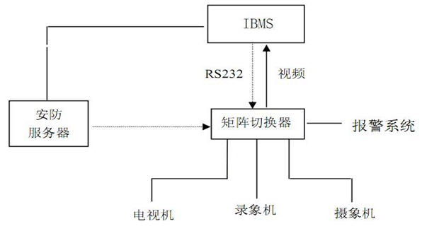 1.BMS与安防系统通过 TCP/IP 连接。从安防系统取得所有信息,包括视频,并通过安防系统控制矩阵切换,再由安防服务器通过 RS232 接口,将其控制信号传输给矩阵切换器,从而达到控制矩阵下属现场设备的目的。只需要安防系统提供软件接口即可,如上图所示。
