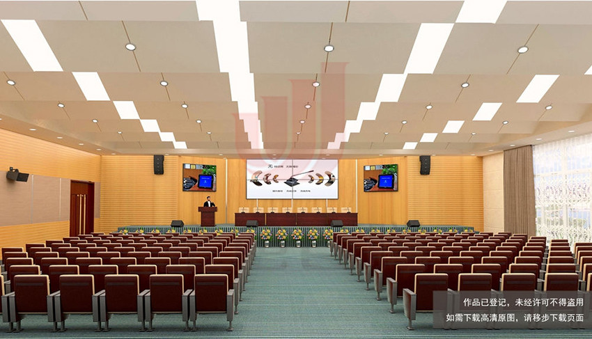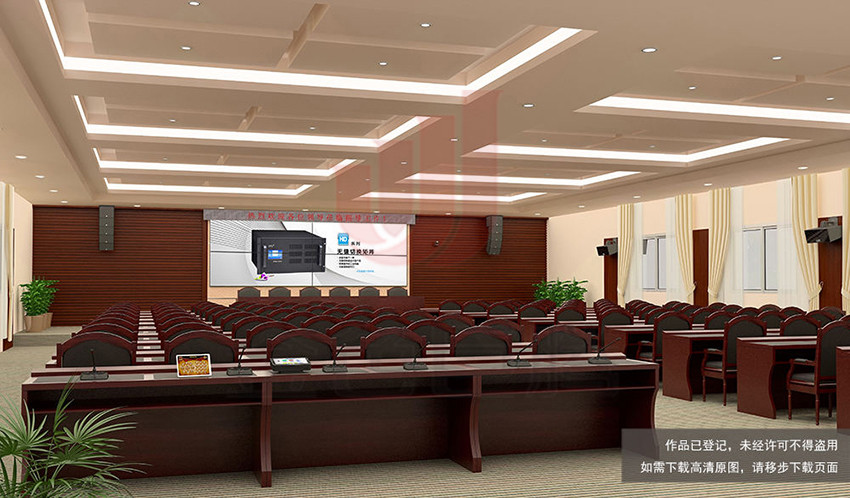 为获得更高的声压级和较强的指向性,该多功能报告厅我们设计配置8只SVS 8寸线阵扬声器(L-8),2只15寸超低扬声器(L-15B),于主席台LED显示屏两侧吊挂安装。采用左右声道立体扩声方式,有效的降低了声像失真,从而使与会人员获得更好的听觉效果。