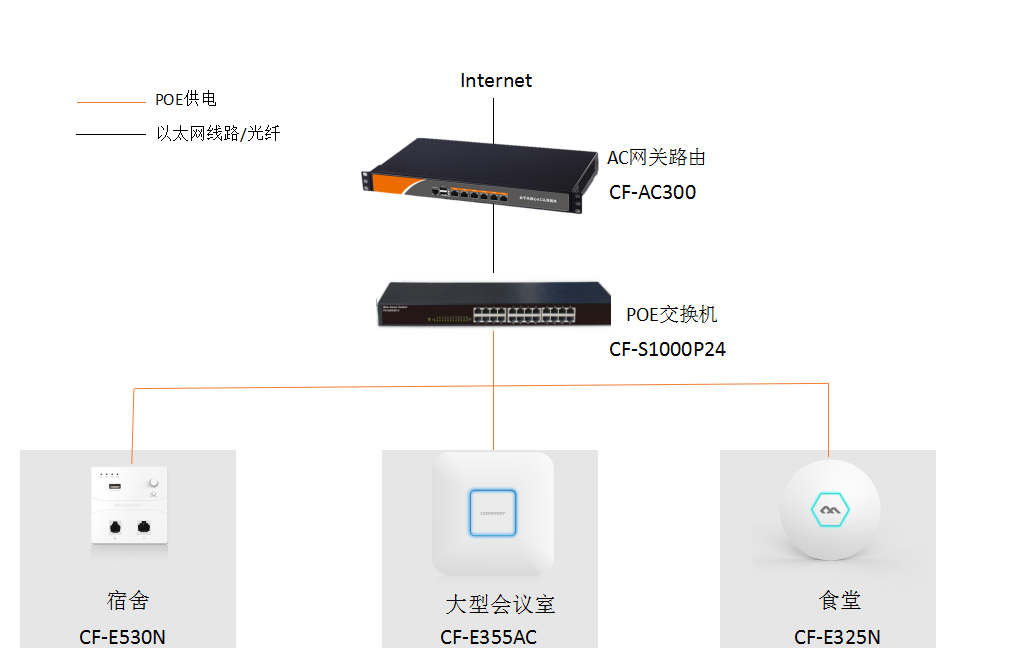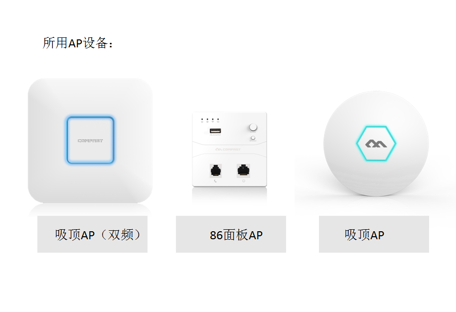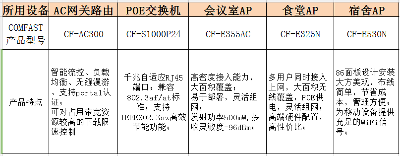 CF-E325N和CF-E355AC均支持吸顶和壁挂安装,CF-E355AC采用新一代802.11ac双频技术,提供1200Mbps的无线速率,非常适合食堂、厂房、仓库等面积较大环境;工程用户对工程组网的成本一般都会有严格的预算,所以CF-E325N作为工程用户期待的高性价比产品在工厂的无线网络构建中,可以运用于食堂等对无线网络要求相对低的环境。CF-E530N采用国际标准86面板设计,无线速率可达300Mbps,相对更适合宿舍等房间密集型环境。很多酒店类的客户也会选择COMFAST E530N做客房覆盖。