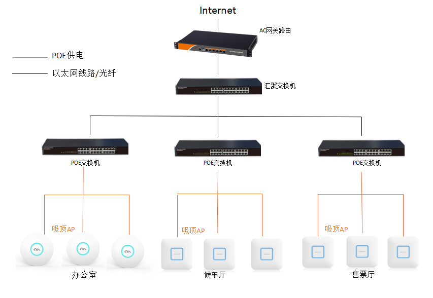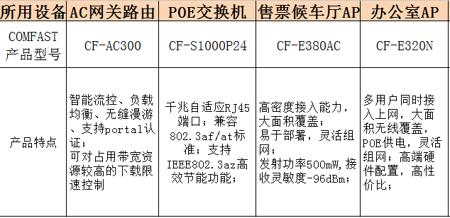 方案前端采用COMFAST核心网关CF-AC300,具备集中控制、本地认证等功能。方案中使用的交换机为COMFAST 24口千兆POE交换机。售票厅、候车厅等人流密集的场所使用COMFAST千兆双频AP作覆盖,办公室采用COMFAST单频吸顶AP。