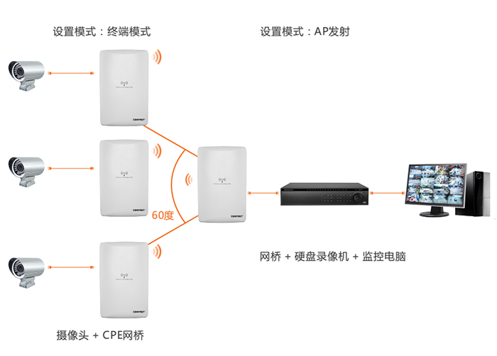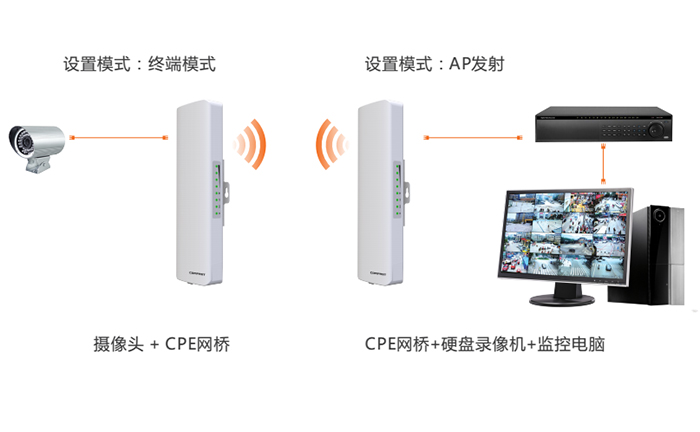 COMFAST安防监控WiFi传输解决方案中所采用的CPE设备在国内具备绝对的市场领先性,我们通过工程应用中得到的宝贵经验,创新了CPE产品的几大功能,为广大安防监控工程提供无尽的便利。