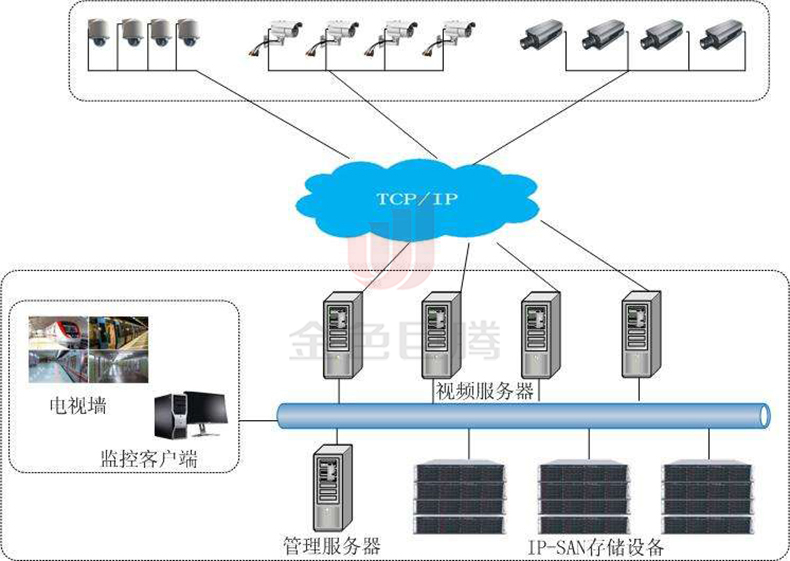 对于其中的集中存储IPSAN的存储方式,在视频监控市场中,IPSAN作为一种数据集中式管理方案,在大规模的视频应用部署环境中,具有明显的优势。随着云计算和云存储概念的产品化,高清视频监控系统迎来了大数据云端化时代,海量数据存储及智能视频分析技术用于大安防时代下的解决方案,能够快捷、简便、高效地解决数据安全和管理、视频应用等多业务融合。相对NVR和混合型DVR的分布式存储而言,IPSAN更重视数据的集中存储和统一管理,并具有非常出色的容量扩展能力,因此IPSAN更适用于大规模部署。为适应高清化时代下的数据存储,IPSAN专业数据存储产品也出现了更加适合于视频监控系统使用的行业存储产品,如EVS、SVR、ESS等。这些产品以专业存储产品形态支持前端视频流的直存式接入,既支持专业数据存储功能,又能够通过各种视频流协议接入前端不同类型的摄像头(如EVS系列采用流媒体协议、ESS系列采用iSCSI协议直存等),同时具备丰富的本地视频数据管理功能,适应数据集中存储的大融合平台管理,实现基于iSCSI协议数据存储功能和强大的容量扩展能力。