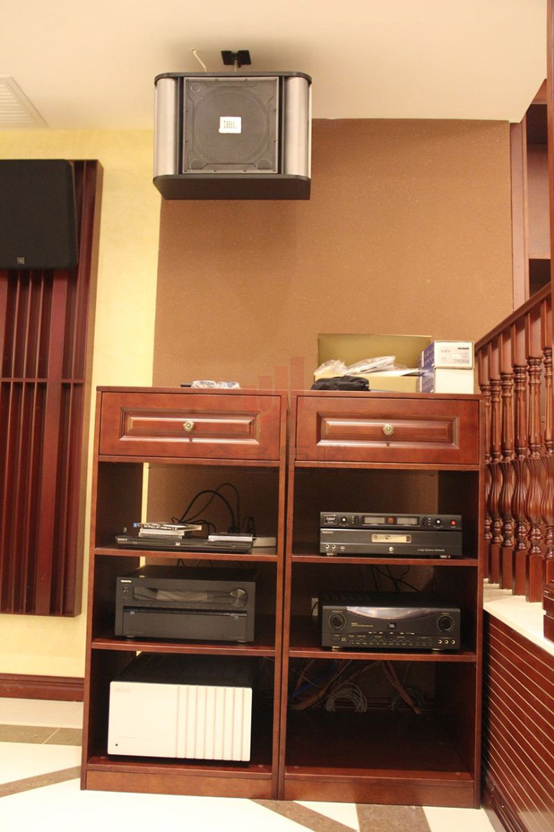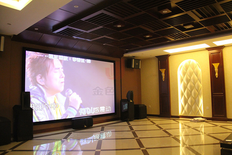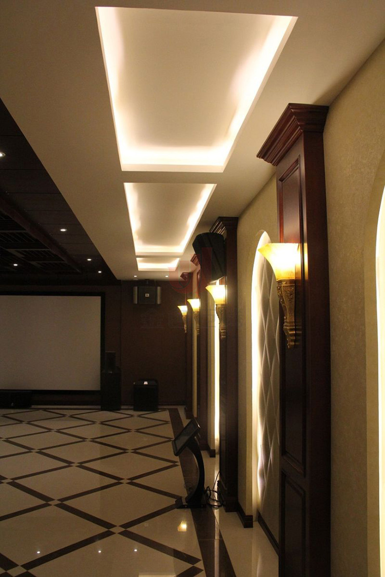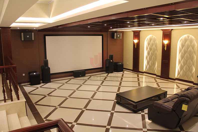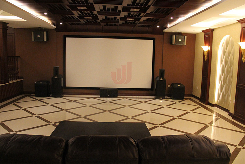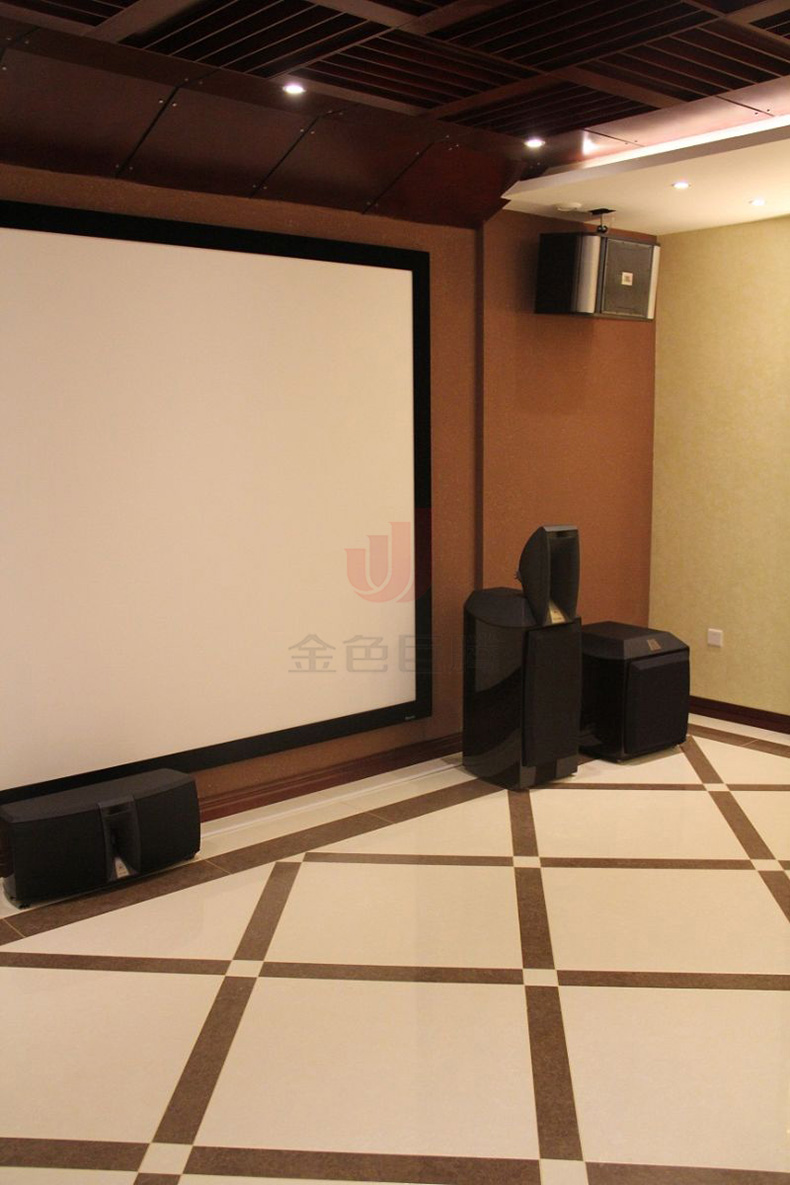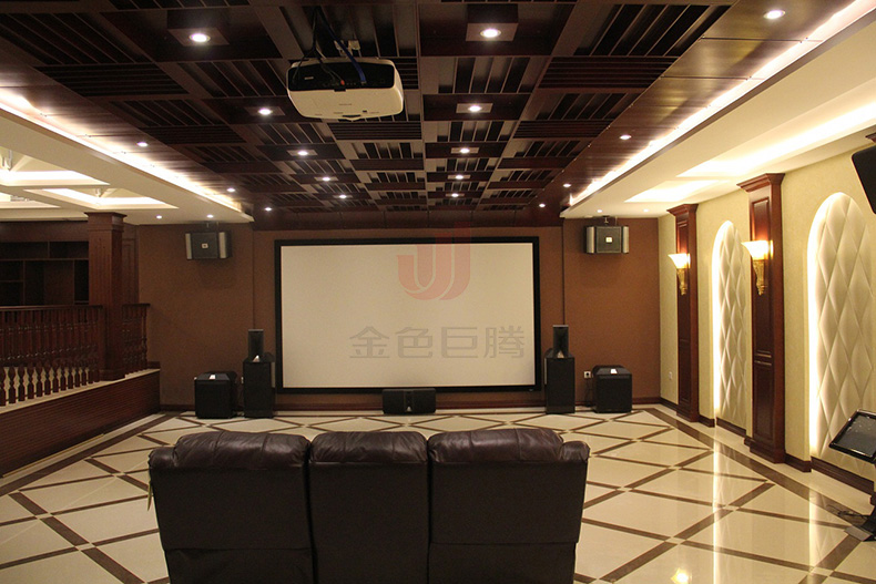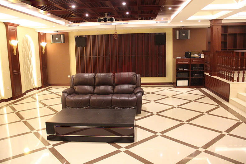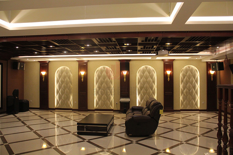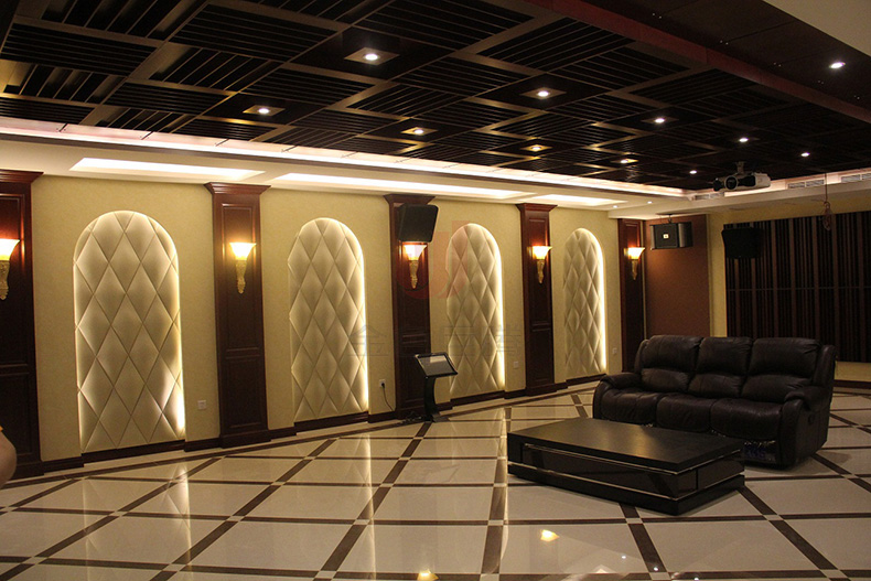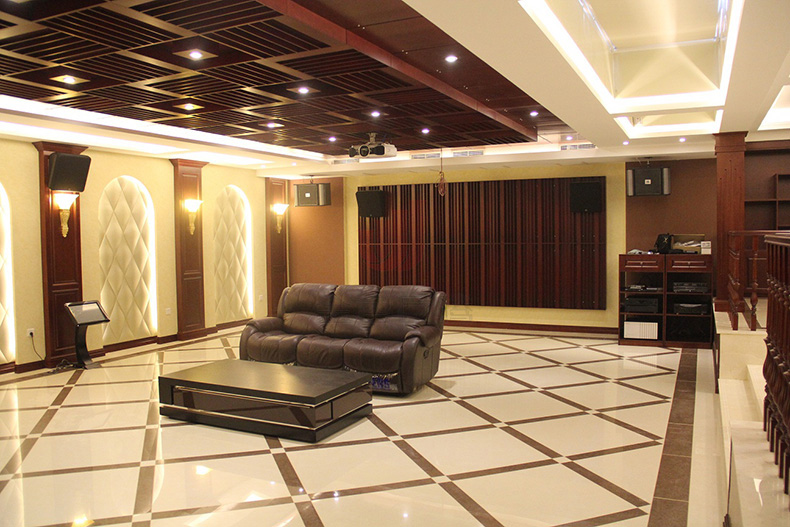 较大的空间对音响整体素质与功率带了了较高的要求。视听室的声学处理我们提供了扩散与吸声并用的方法,天花与前后墙大面积使用QRD二次余数扩散体,左右墙壁适当使用软包块进行吸音处理。